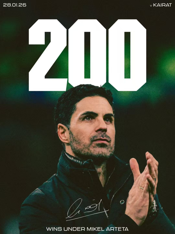 虎扑01月29日讯在3-2战胜凯拉特阿拉木图的赛事 中,米克尔-阿尔特塔迎来了他作为我们主指导教练员的第200场获胜 。凯-哈弗茨、哲凯赖什和加布里埃尔-马丁内利的得分 帮助主帅达到了这一双百胜的里程碑。