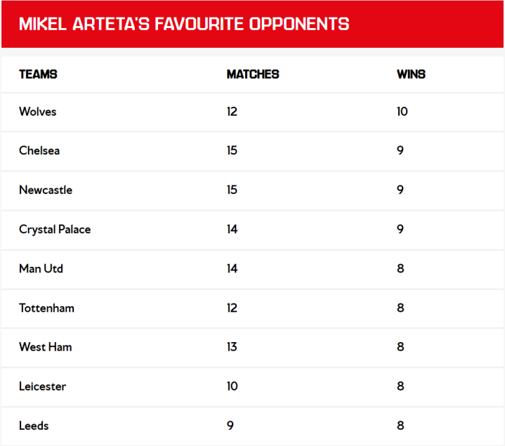 紧随其后的是五支米克尔曾八次战胜的球队。这其中包括热刺,在仅仅12场北伦敦德比中赢了8次,以及对阵曼联、西汉姆联、莱斯特城和利兹联也各取得了8场获胜 。